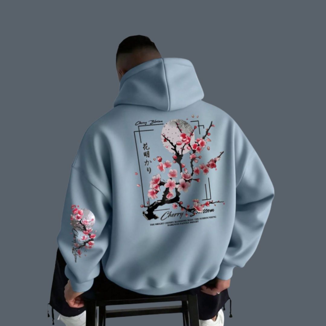 Experience the beauty of spring year-round. The “Sakura Bloom” Hoodie is a beautifully layered piece that combines traditional floral motifs with modern graphic design. Featuring a central teal “moon” backdrop and delicate pink cherry blossoms, this hoodie offers a serene, high-end look What sets this piece apart are the detailed sleeve prints, featuring cascading blossoms and vertical typography that ensure you look stylish from every angle.