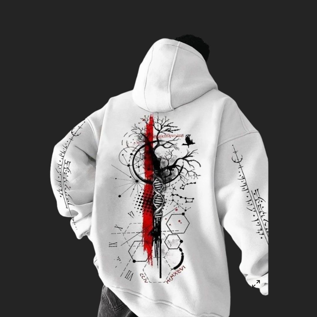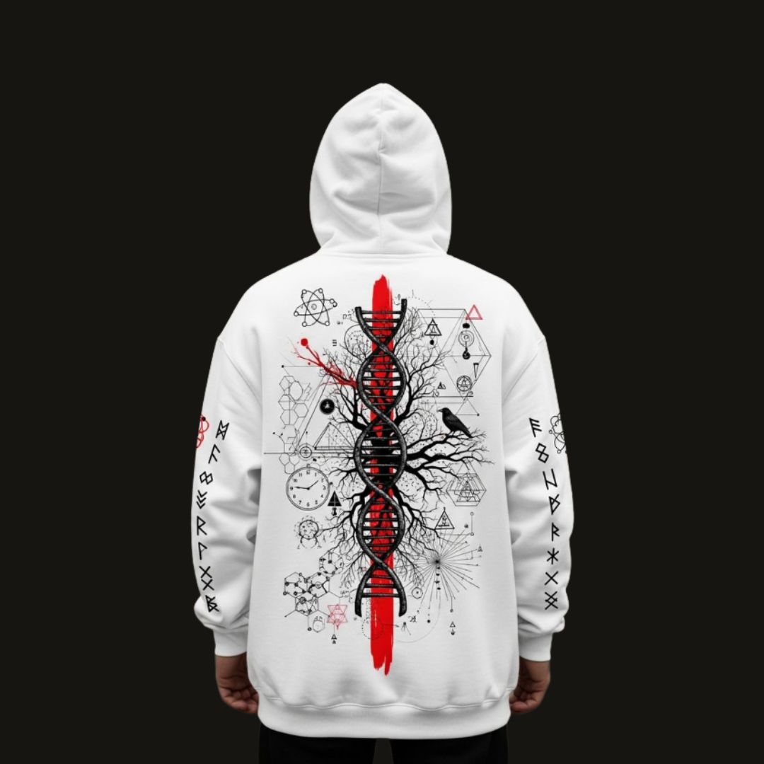 Redefine your streetwear style with this bold and artistic hoodie that blends science, nature, and mystery into one powerful design. Featuring a striking DNA double-helix merging into a tree silhouette, highlighted by a bold red vertical streak, this hoodie symbolizes life, growth, and individuality