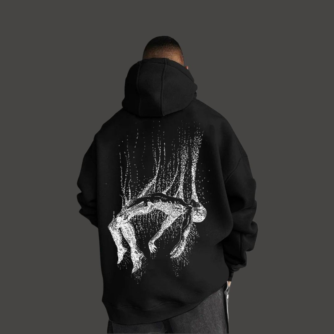 Step into bold streetwear with this striking dark aesthetic hoodie, designed for those who like to stand out without being loud. Featuring a unique back print of a suspended human figure in a falling or floating motion, this hoodie delivers a deep, artistic vibe that blends mystery with modern fashion