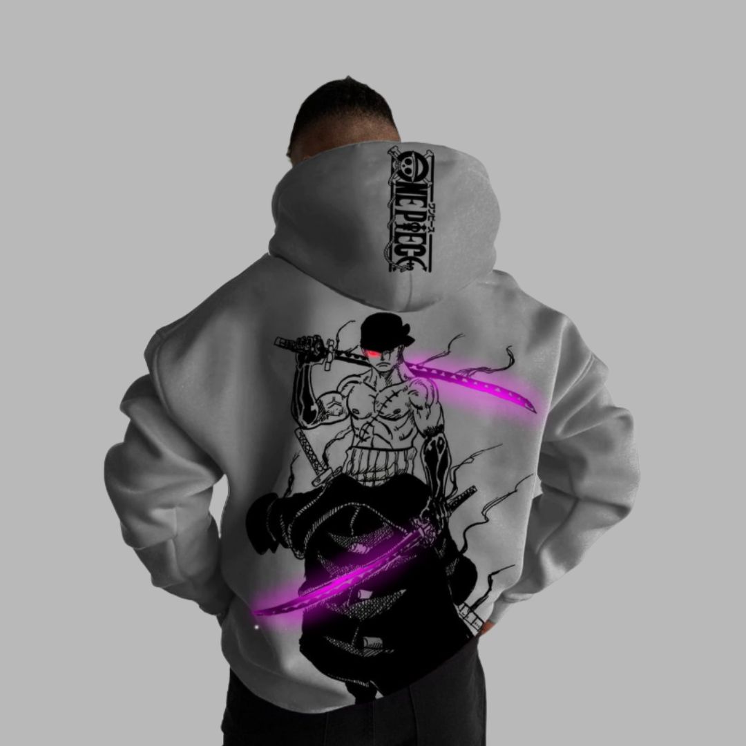 Upgrade your streetwear game with this bold and stylish anime-inspired hoodie. Designed for comfort and attitude, this piece features a powerful warrior graphic on the back, highlighted with eye-catching neon purple sword effects that give it a modern, edgy vibe