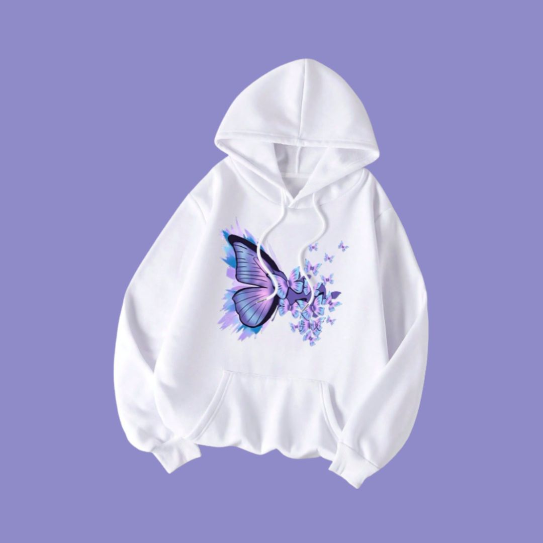 Float through your day in style with the Ethereal Butterfly Dreams Hoodie. Designed for those who love a mix of clean aesthetics and bold graphics, this hoodie features a stunning watercolor-style butterfly centerpiece. The vibrant shades of lilac, cobalt, and violet create a “butterfly effect” that spreads across the chest, making it an instant eye-catcher