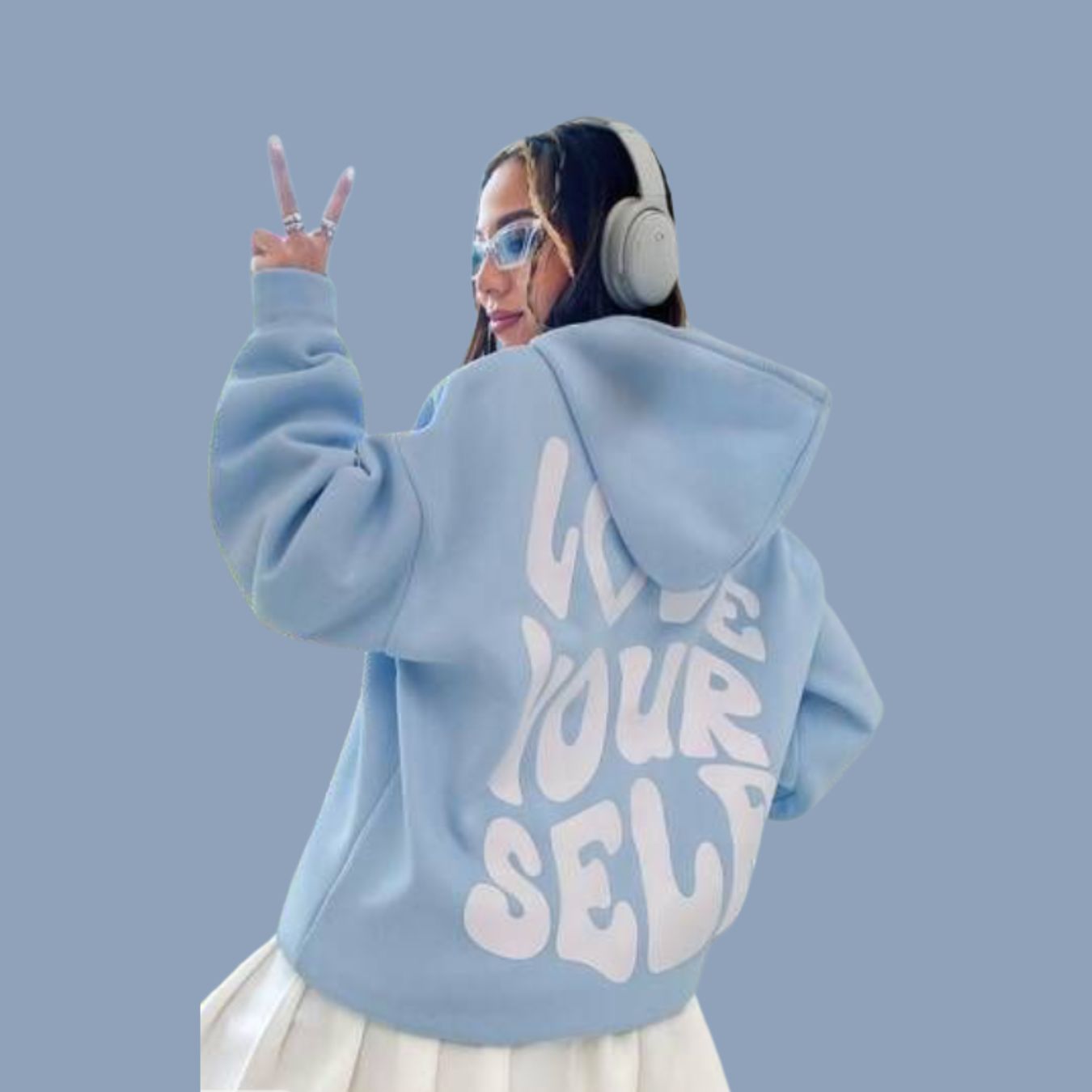 Wear your heart on your sleeve—and your back. The “Love Yourself” Oversized Hoodie combines a powerful message with a trendy, retro-inspired aesthetic. Featuring a striking warped-text design across the back, this hoodie is designed to be a daily reminder of self-care and confidence