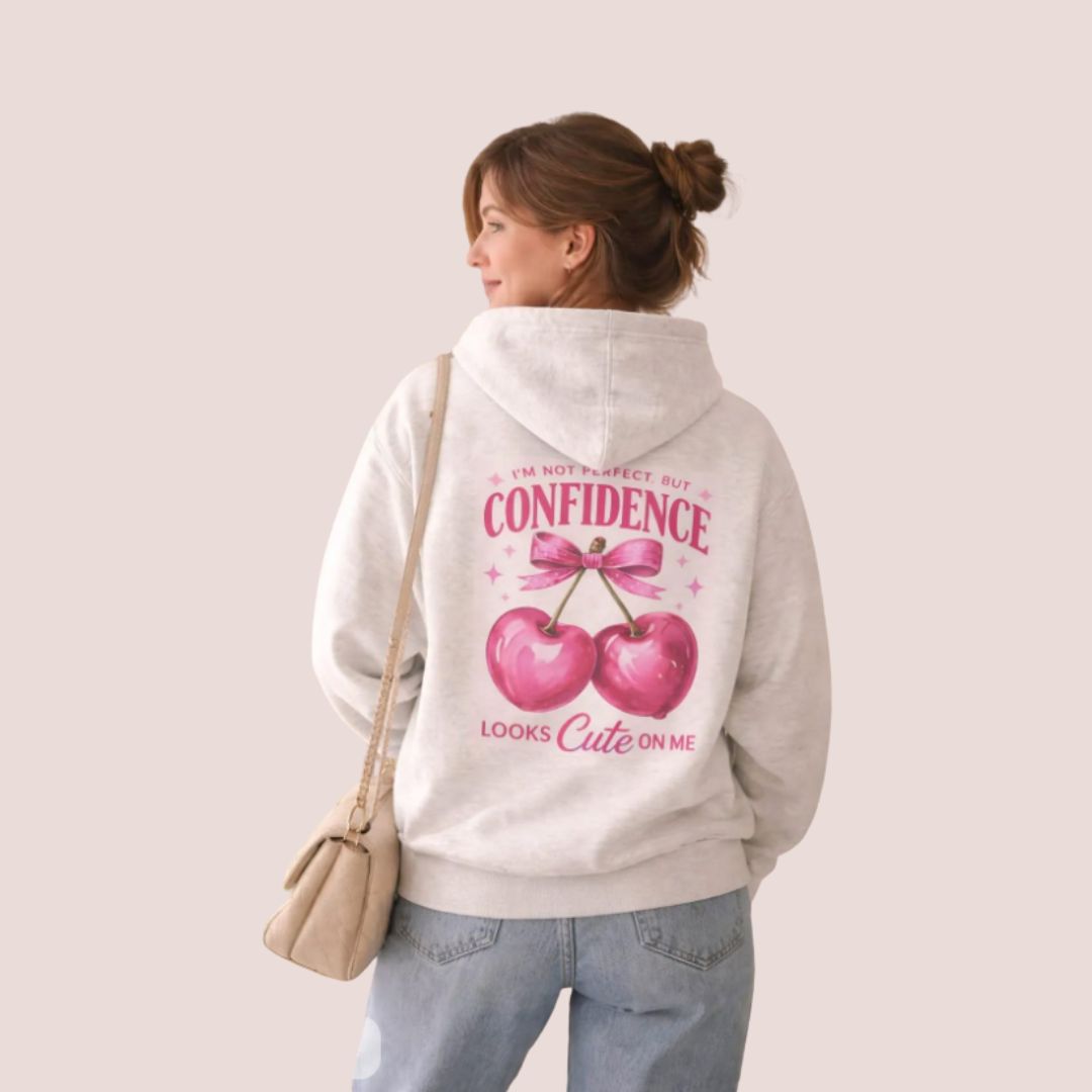 Sweet, sassy, and effortlessly stylish. Our “Confidence Looks Cute” Hoodie is the ultimate mood-booster for your wardrobe. Featuring a beautifully illustrated duo of vibrant pink cherries topped with a delicate coquette bow, this hoodie balances a vintage feminine vibe with modern streetwear comfort.