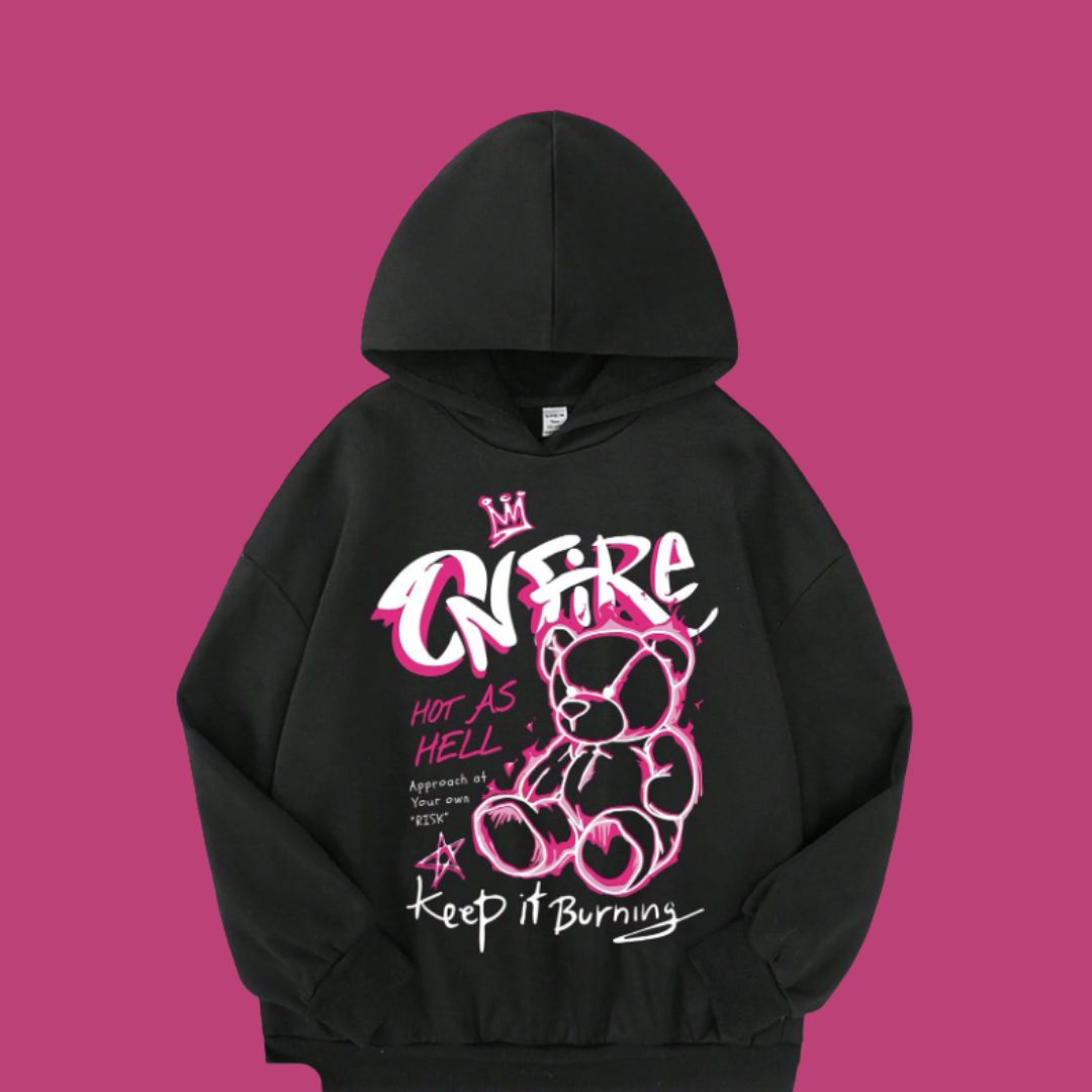 Turn up the heat on your daily rotation. The “Keep It Burning” Hoodie is for those who aren’t afraid to stand out. Featuring a rebellious, neon-pink graffiti aesthetic on a deep black canvas, this piece blends the “cute but dangerous” teddy bear motif with raw, street-style typography With its oversized silhouette and “Hot As Hell” messaging, it’s the ultimate statement layer for the modern rebel