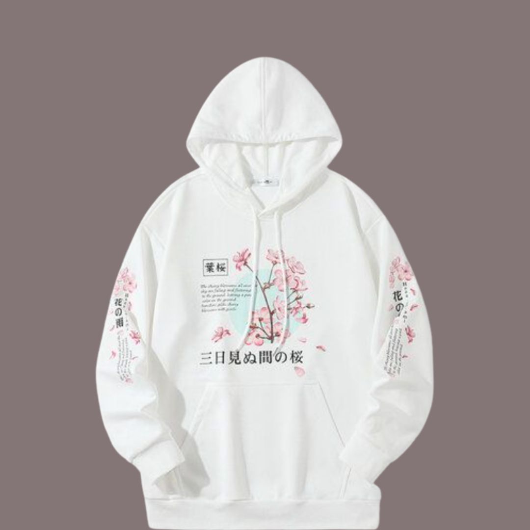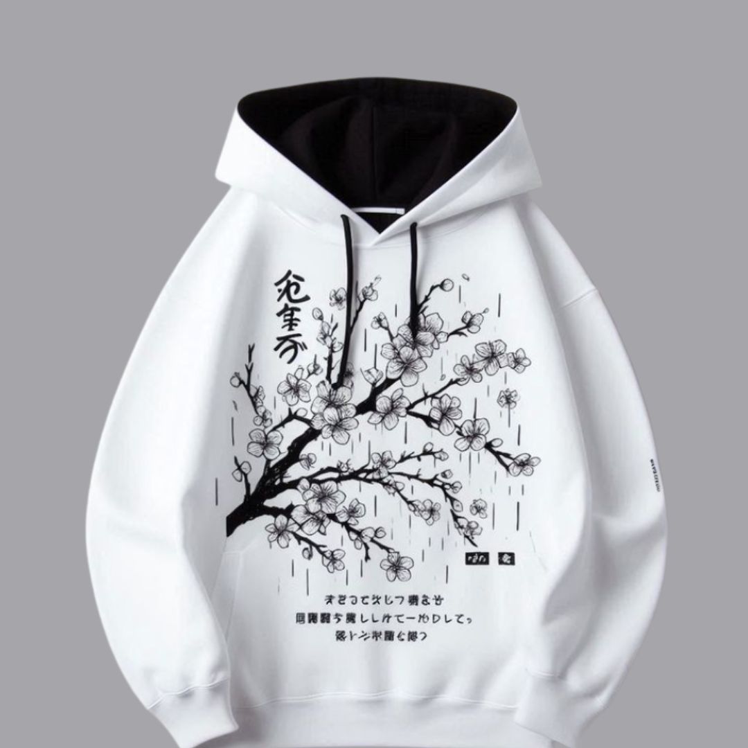 Simplicity meets artistry. The “Ink Sakura” Hoodie is a masterclass in monochrome design. Set against a crisp white canvas, the detailed black ink-style illustration of a blooming cherry blossom branch creates a look that is both peaceful and powerful The standout feature is the bold color-block contrast: a deep black interior lining in the hood and matching black drawstrings that perfectly frame the face and tie the whole aesthetic together.