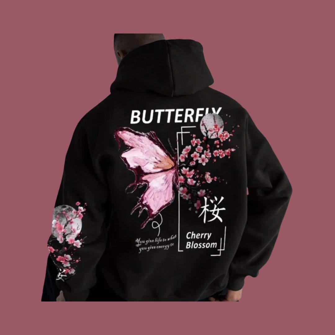 Add a touch of elegance and street style to your wardrobe with this beautifully designed hoodie. Featuring a stunning butterfly graphic paired with delicate cherry blossom elements, this piece blends nature-inspired art with modern streetwear aesthetics